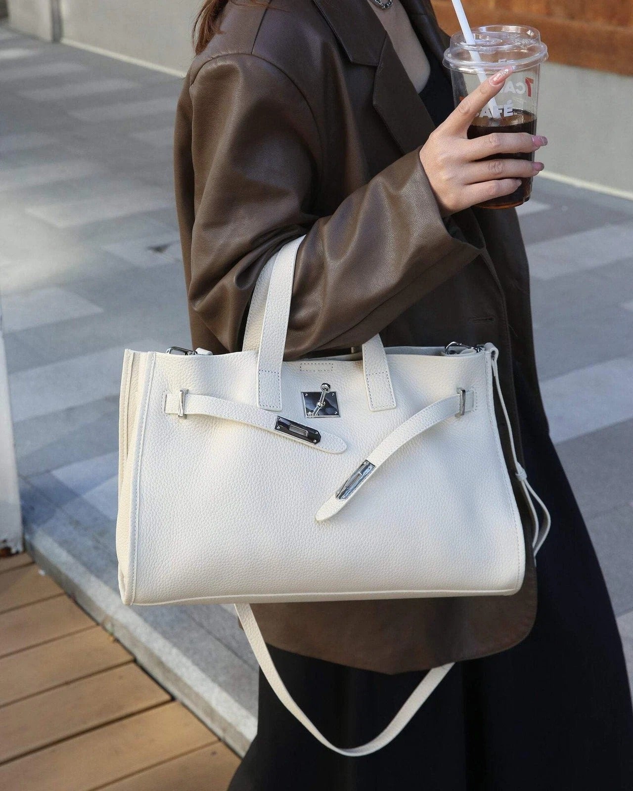 Crafted from pebbled vegan leather with sleek silver hardware, this structured tote offers a modern twist on classic elegance. The unique folded belt strap and polished front clasp make a bold style statement, whether you're heading to a meeting or strolling through the city.