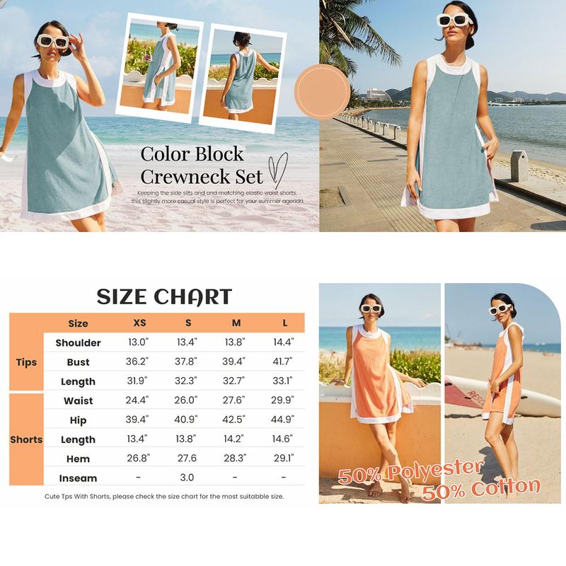 This stylish two-piece set includes a sleeveless pullover top with a classic crewneck, bold color-block design, and subtle side slits for added ease and movement. It’s perfectly paired with solid shorts featuring practical side pockets, creating a relaxed, effortlessly chic silhouette that's as flattering as it is comfortable. Whether you’re lounging or heading out, this set offers the perfect blend of casual style and laid-back charm.